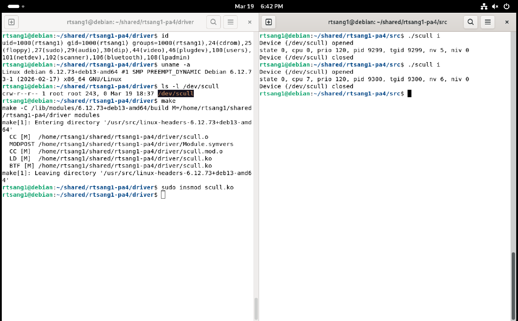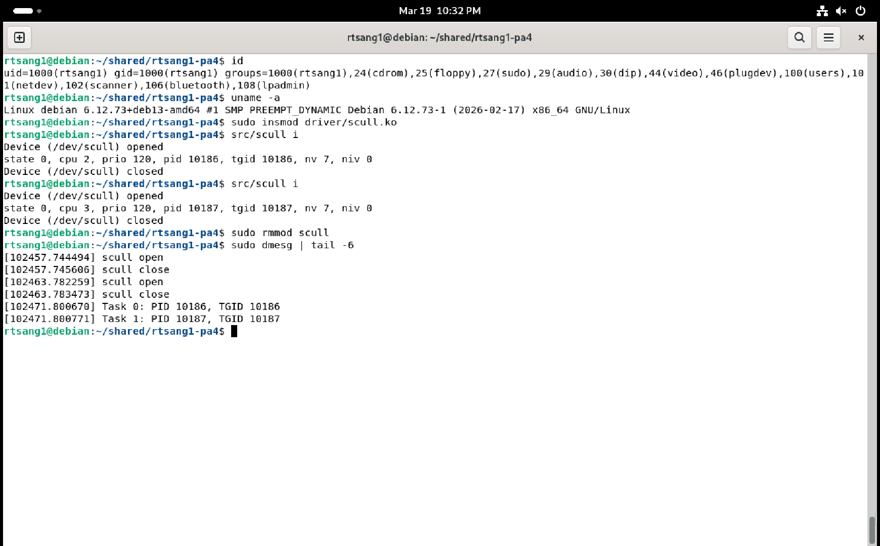 You must provide a single screenshot that shows a Debian terminal window that shows the output of the id command, followed by the module being loaded into the kernel, followed by the scull i user-space test command being run twice in a row, followed by the module being unloaded from the kernel, followed by the output of the sudo dmesg | tail -6 command, showing the last six lines of what your module printed to the kernel log. Check that the PIDs / TGIDs shown in the kernel log when unloading the module match the PIDs / TGIDs printed by the two runs of the user-space scull i test program, and in the correct order, otherwise you will not get points!