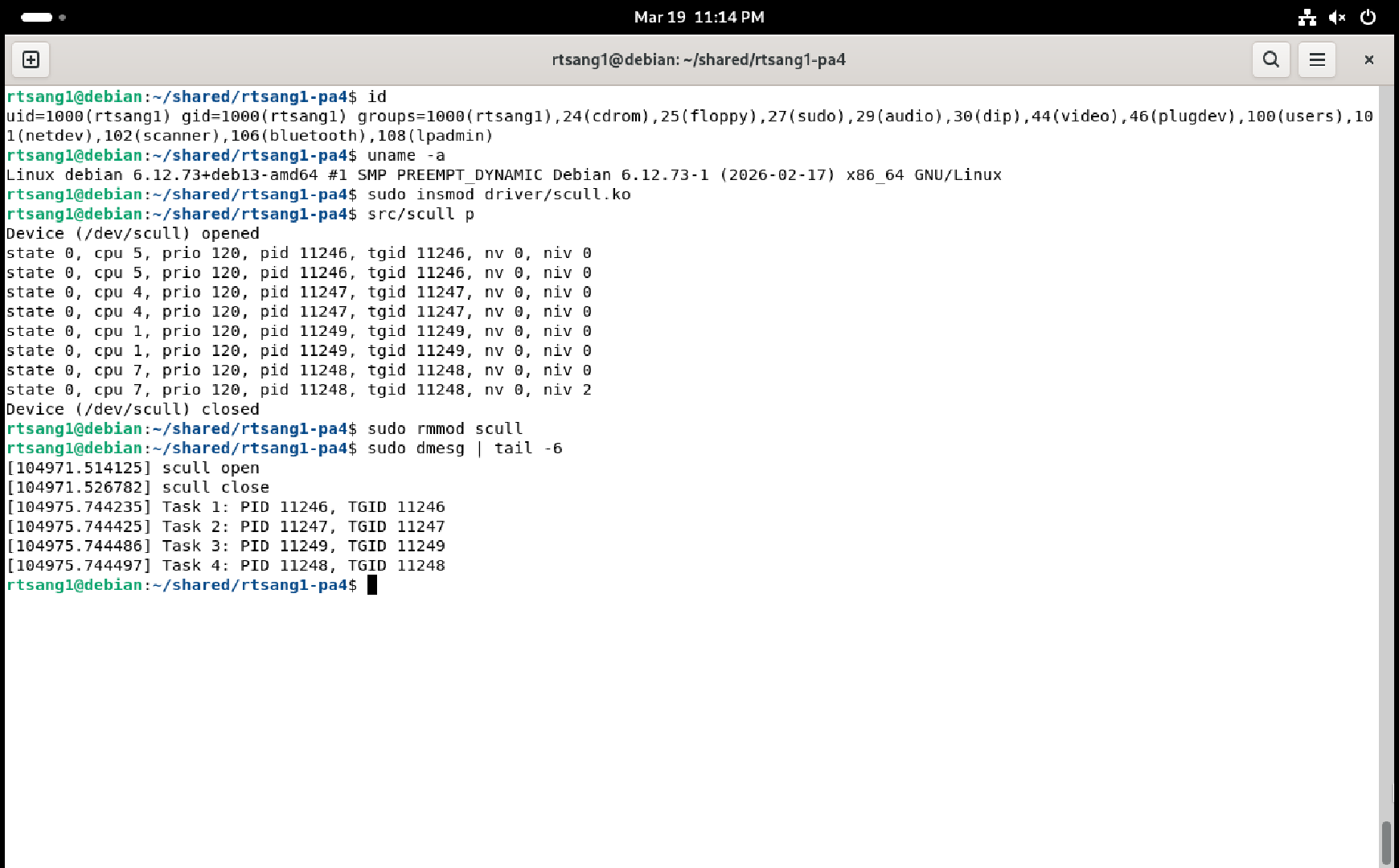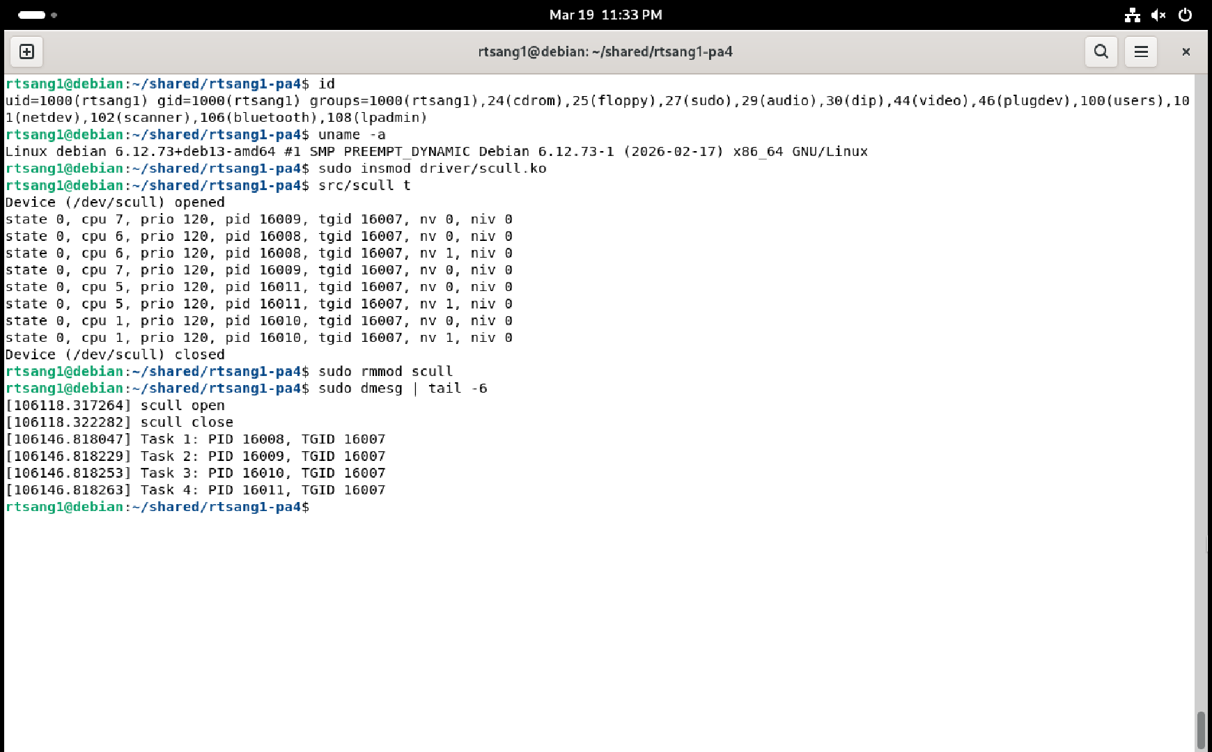 You must provide a single screenshot that shows a Debian terminal window that shows the output of the id command, followed by the module being loaded into the kernel, followed by the scull t user-space test command being run once, followed by the module being unloaded from the kernel, followed by the output of the sudo dmesg | tail -6 command, showing the last six lines of what your module printed to the kernel log. Check that the PIDs / TGIDs shown in the kernel log when unloading the module match the PIDs / TGIDs printed by the single run of the user-space scull t test program, otherwise you will not get points! Each PID / TGID pair must also only appear once in the kernel log because duplicates are forbidden in the linked list kept by the character device driver’s code. For example: